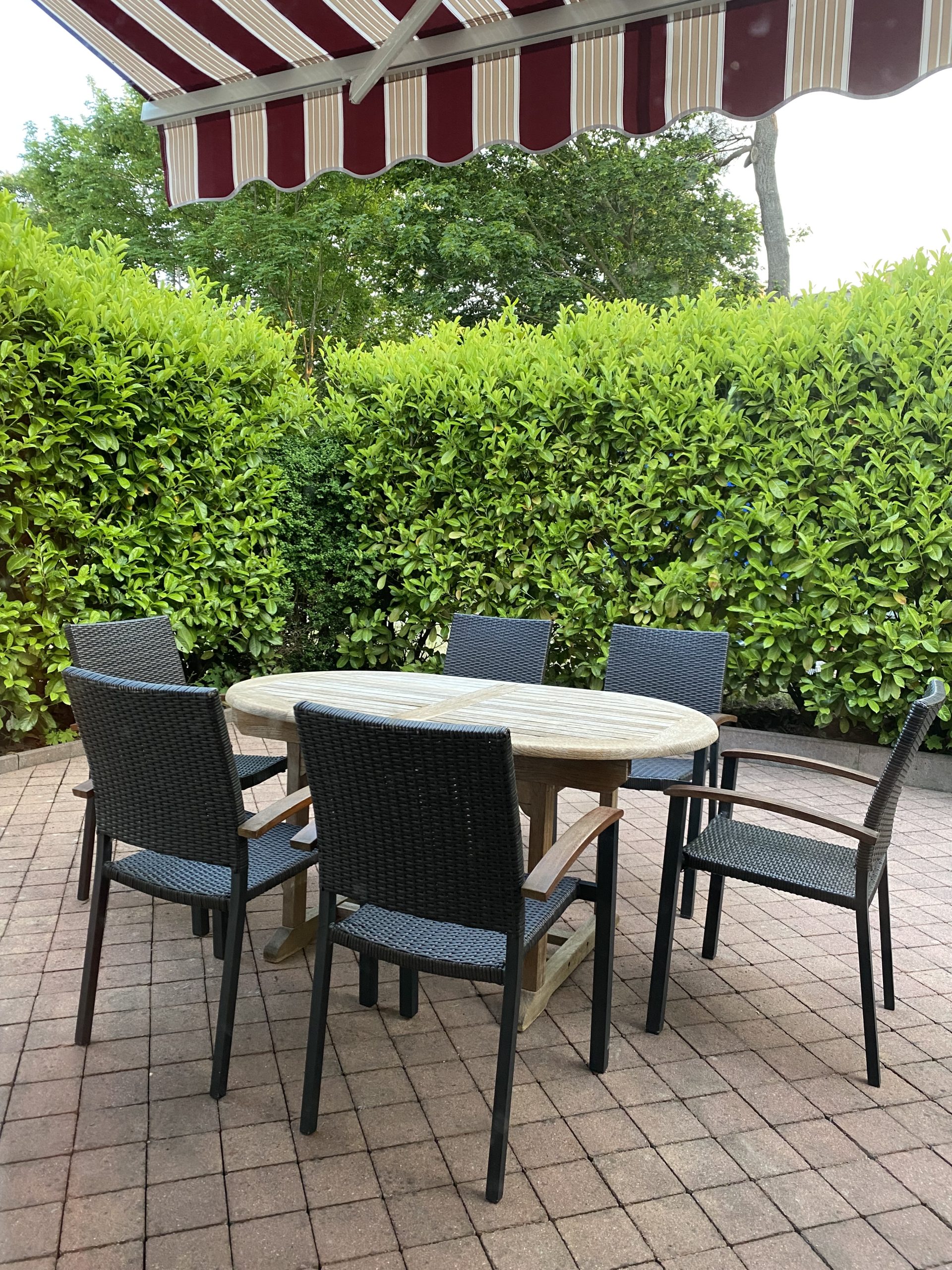 Draußen vor der Tür wartet eine großzügige, bestuhlte Sonnenterasse (30 qm) mit Markise auf Sie. Vom Grill bis zum Sonnenschirm steht Ihnen alles zu Verfügung um einen schönen Urlaub zu genießen.